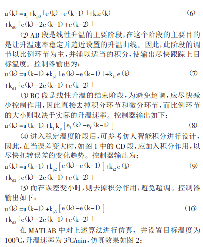 根據(jù)系統(tǒng)特性,設(shè)計控制規(guī)則如下: (1)在啟動階段,由于系統(tǒng)存在一定的時滯和較大的慣性,必須加以比較強的控制作用,才能使系統(tǒng)盡快響應(yīng)因此應(yīng)根 據(jù)本階梯的穩(wěn)定溫度和升溫速率加入前饋控制量 ,控制器輸出為: