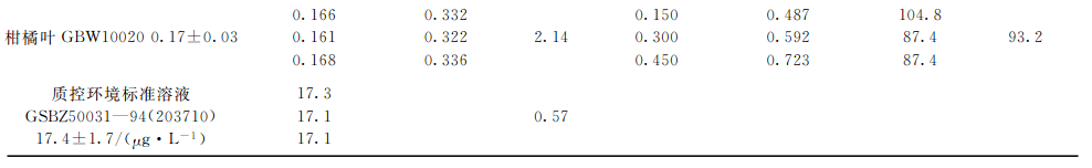分別選取灌木葉、大米、圓白菜、茶葉和柑橘葉五種植物標(biāo)準(zhǔn)樣品,每種重復(fù)3次準(zhǔn)確稱(chēng)取2.0g(精確至0.0001g),按上述實(shí)驗(yàn)條件進(jìn)行消解,測(cè)定本底值。再對(duì)每種植物標(biāo)樣稱(chēng)取子樣,每種重復(fù)3次準(zhǔn)確稱(chēng)取2.0g(精確至0.0001g),此次每種試樣中分別加入1.0mg?L-1硒標(biāo)準(zhǔn)溶液150,300,450gL,進(jìn)行消解并測(cè)定加標(biāo)后值,同時(shí)測(cè)定硒質(zhì)控環(huán)境標(biāo)準(zhǔn)溶液(GSBZ50031-94(203710)),結(jié)果見(jiàn)表4。可見(jiàn),硒標(biāo)準(zhǔn)加標(biāo)回收率在87.1%~106.2%之間,精密度(n=3)在0.83%~5.69%之間,所測(cè)結(jié)果均與標(biāo)準(zhǔn)物質(zhì)的參考值吻合,完全達(dá)到分析要求。