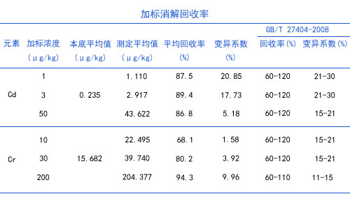 本試驗采用的石墨消解儀硝酸濕法消解方式,僅需1次前處理方法,可以同時檢測鎘、鉻、2種重金屬元素,操作簡 便,試劑耗材消耗量少,節(jié)約了成本,石墨消解儀具有批處理量大且無需實驗人員值守的優(yōu)點,安全性系數高,一 般性實驗室均可采用。
